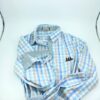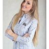 Camisa Feminina Social Xadrez Rosa e Azul claro, com botões simples e detalhes listrados na gola, punhos e ao longo central da peça.
