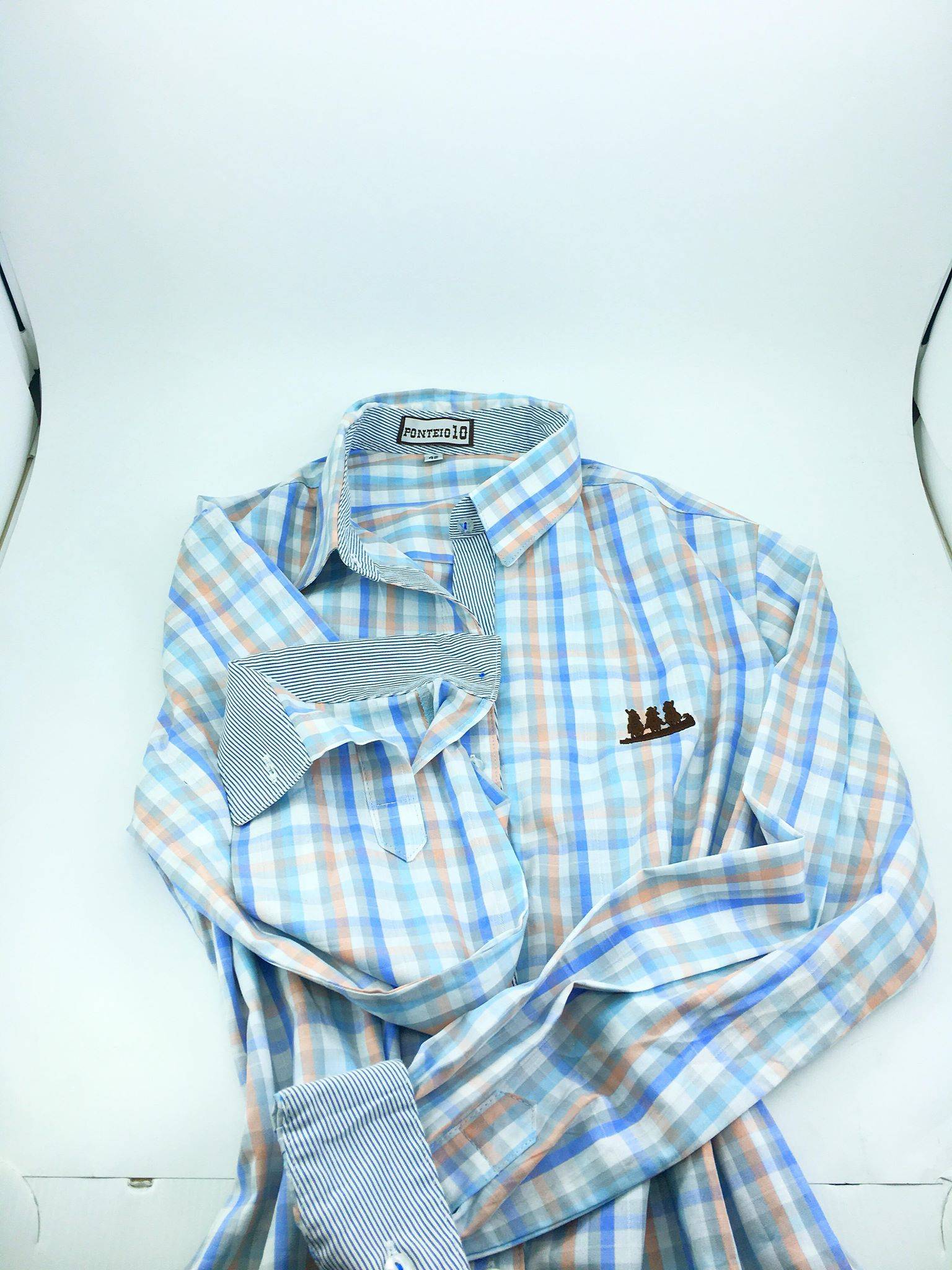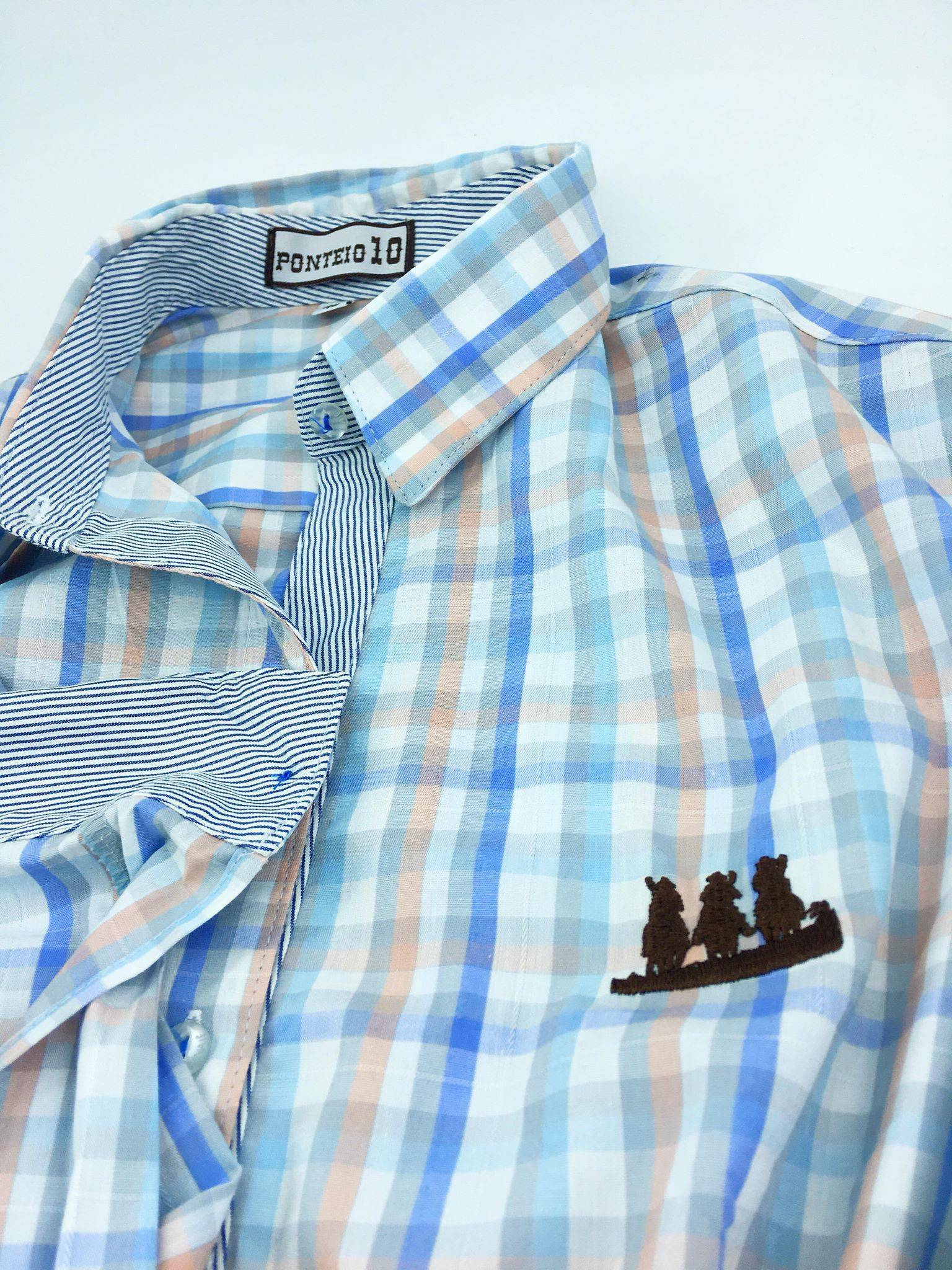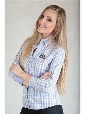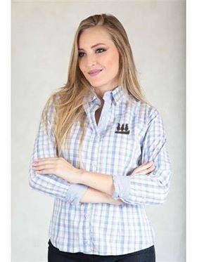 Camisa Feminina Social Xadrez Rosa e Azul claro, com botões simples e detalhes listrados na gola, punhos e ao longo central da peça.